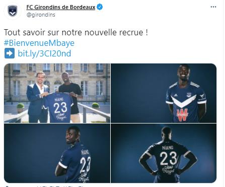 | ▲ 음바예 니앙 영입을 발표한 보르도 [보르도 트위터 캡처. 재판매 및 DB 금지] |