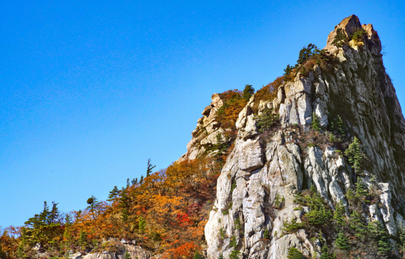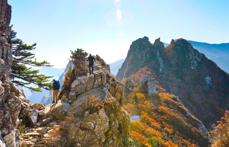 When autumn comes to Seoraksan, known for being one of the first places in the country where fall foliage arrives, it excites enthusiasts of the Dinosaur Ridge circuit. However, hiking the Dinosaur Ridge is not easy. The Dinosaur Ridge circuit is considered a very difficult hike, not only because of the rugged terrain but also because of the length of the course. On the trail, known as the "Dinosaur," hikers have to ascend and descend rocky ridges, rising 100 to 200 meters and then descending again, repeating this process 7 to 8 times. There are no escape routes to descend to the base of the mountain in case of fatigue or emergency situations. Once you start the circuit, there are only two options: to continue to the end or return to the starting point. Since there are no streams along the way, hikers must carry all the drinking water they need. It is recommended to carry more than 2 liters of water, and the weight of the gear, including food, clothing for cold weather and rain, hiking equipment, and emergency supplies, makes the ascent even more challenging.