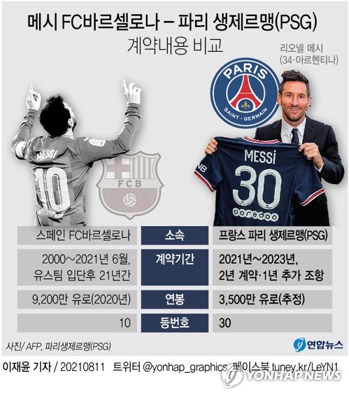 | ▲ [그래픽] 메시 FC바르셀로나 - 파리 생제르맹(PSG) 계약내용 비교 (서울=연합뉴스) 이재윤 기자 = 축구 사상 최고의 선수로 꼽히는 리오넬 메시(34)가 프랑스 파리 생제르맹(PSG) 유니폼을 입었다. yoon2@yna.co.kr |