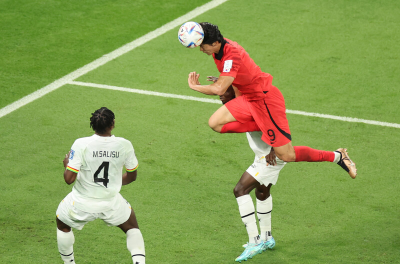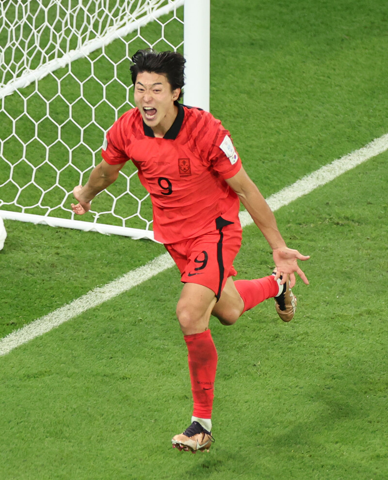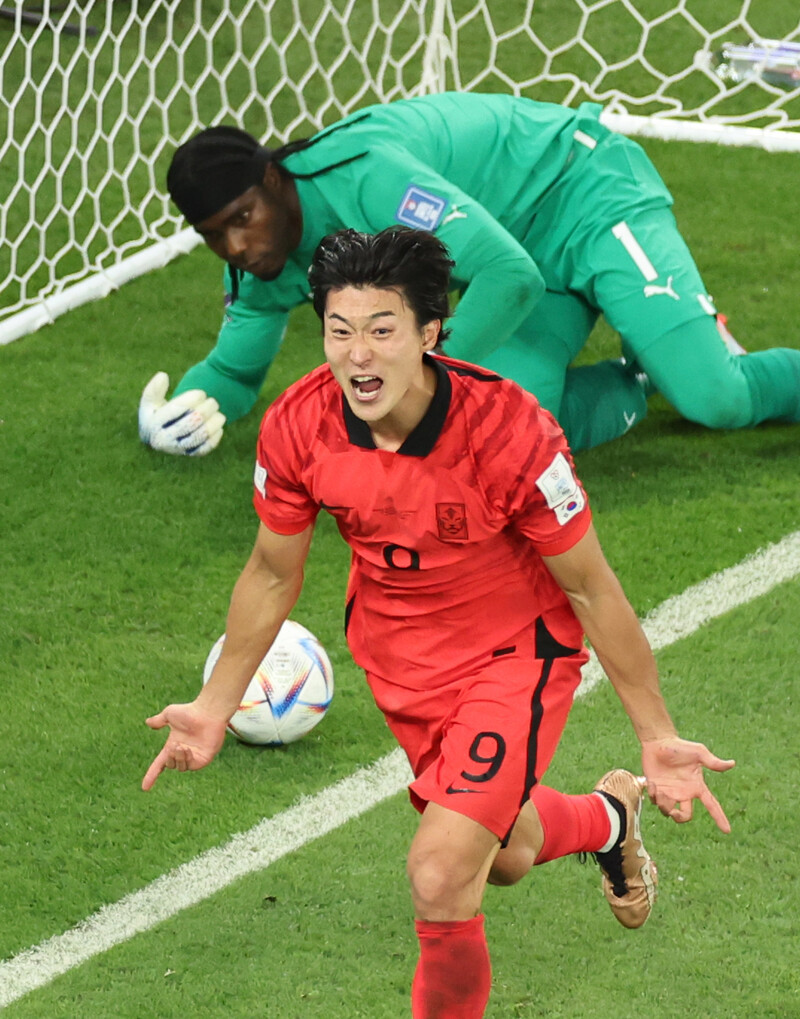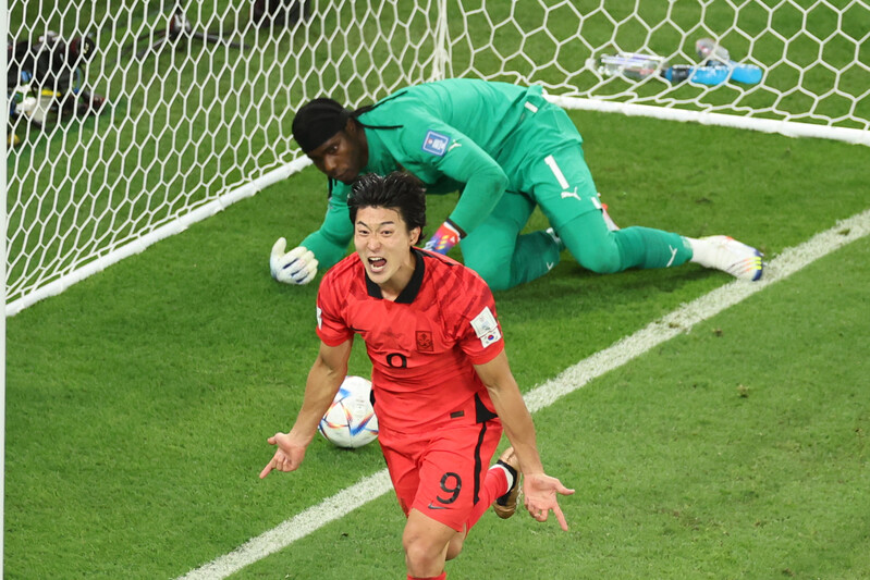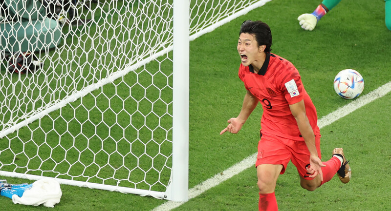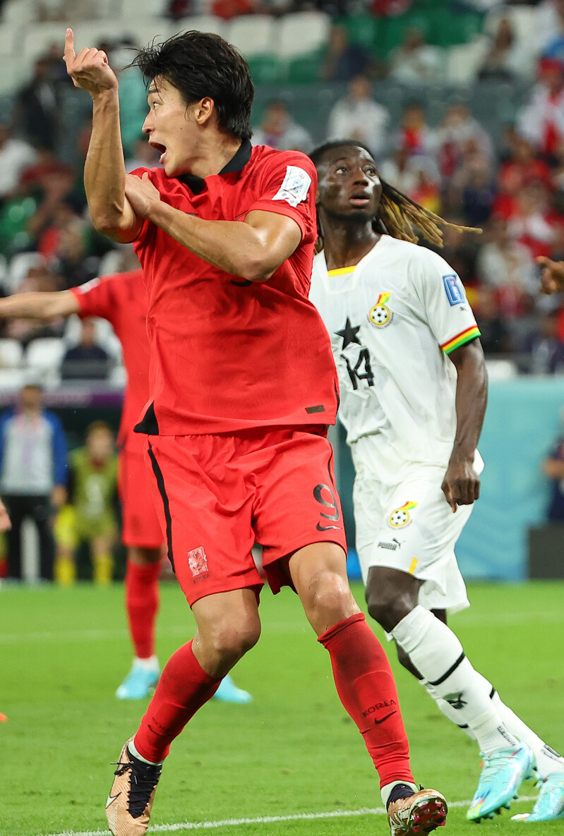 These photos show South Korea national team player Cho Gue-sung at the 2022 World Cup match against Ghana on November 28. Cho Gue-sung, who scored two goals this day is the FW of South Korea national team, and his primary team is Jeonbuk Hyundai Motors.