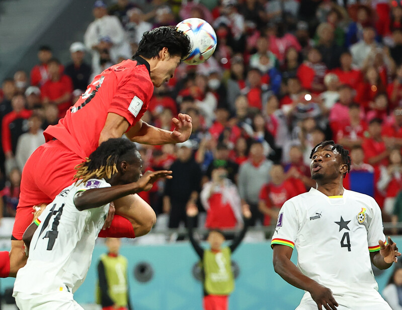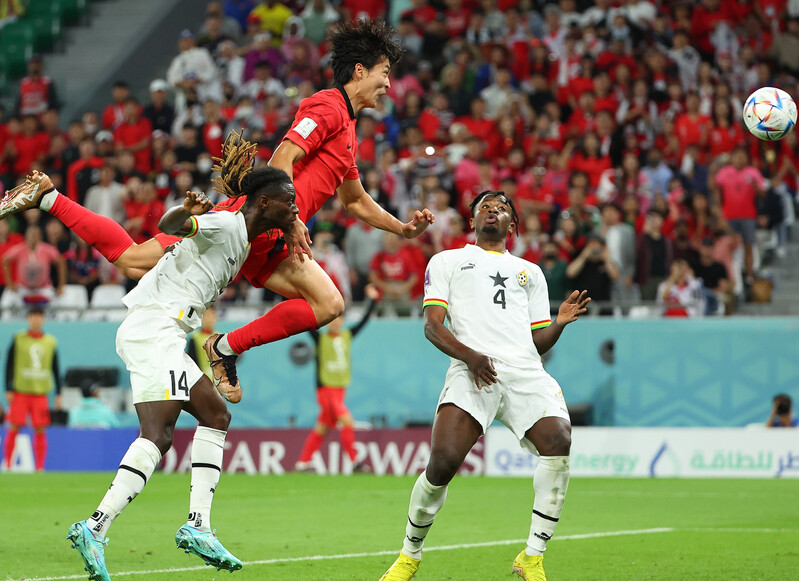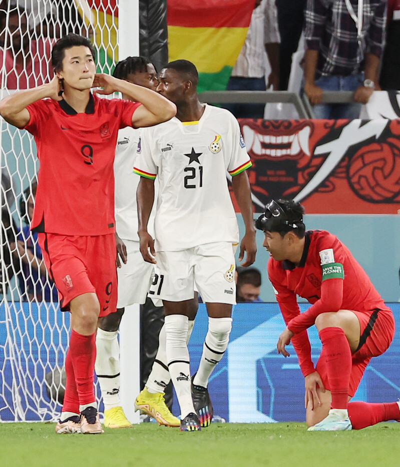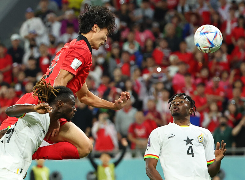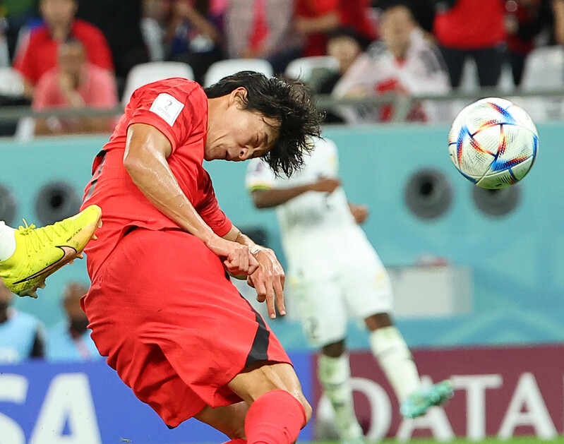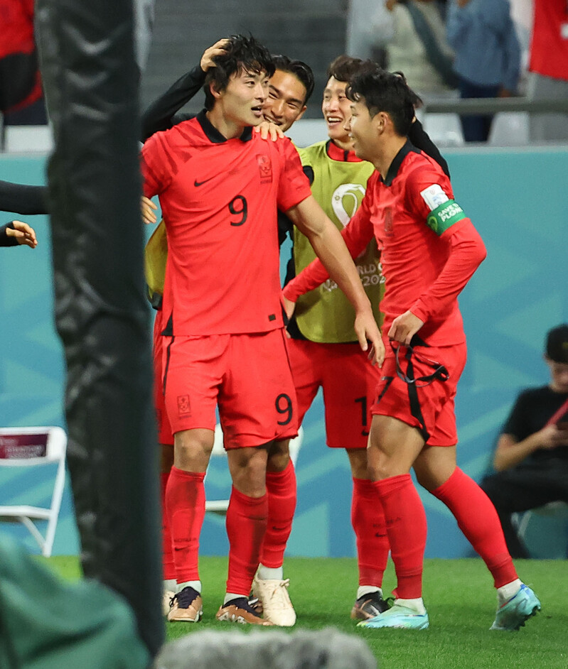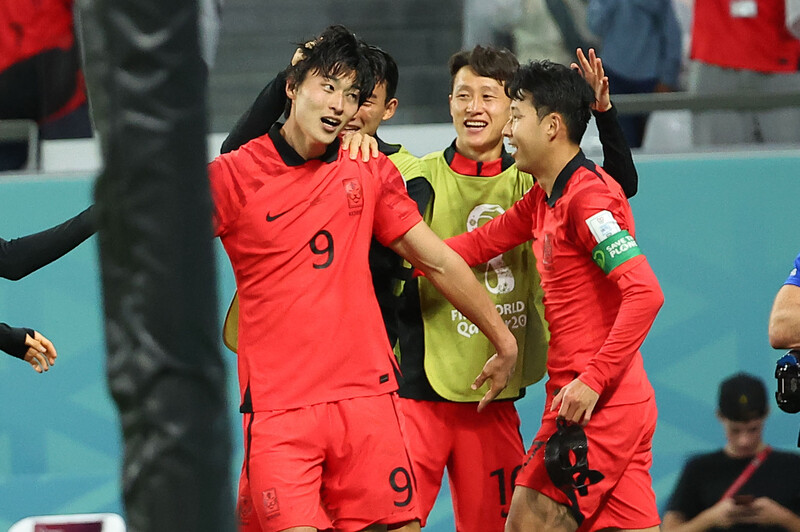 These photos show South Korea national team player Cho Gue-sung at the 2022 World Cup match against Ghana on November 28. Cho Gue-sung, who scored two goals this day is the FW of South Korea national team, and his primary team is Jeonbuk Hyundai Motors.