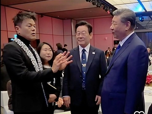 | ▲ Park Jin-young, chairman of the Popular Culture Exchange Committee, speaks with Chinese President Xi Jinping as President Lee Jae-myung looks on, in this photo posted on Park's Instagram. (PHOTO NOT FOR SALE) (Yonhap) |