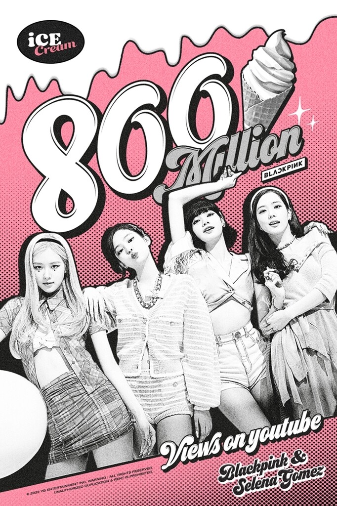 | ▲This photo, provided by YG Entertainment shows celebratory poster of BLACKPINK's music video for 'Ice Cream' exceeding 800 million YouTube Views. (PHOTO NOT FOR SALE) (Yonhap) |