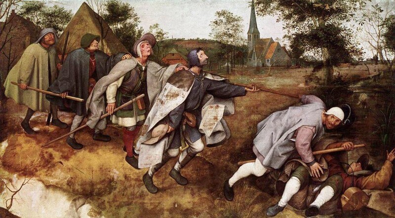 Continuing on, the painting reminds me of the work “The Blind Leading the Blind”(1568) by the artist Pieter Bruegel the Elder (1525?-1569).