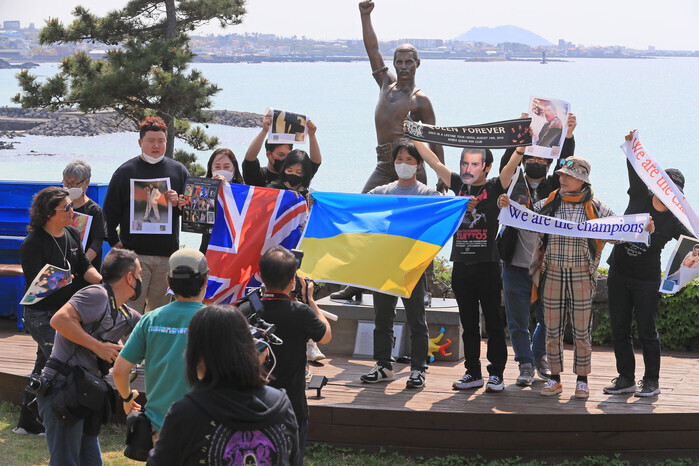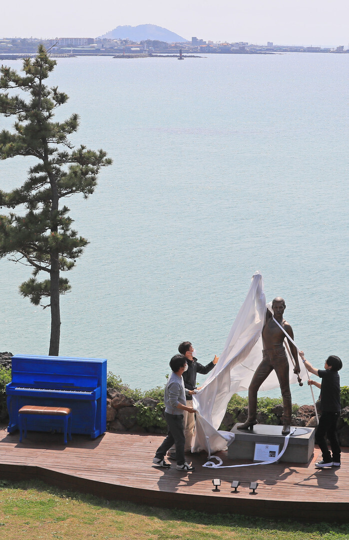 These photos, taken by Park Ji-ho, a photo reporter at Yonhap News Agency's Jeju News Headquarters, show the members of S. Korean fan clubs of the legendary British rock band Queen, who took part in a ceremony to unveil a statue of the band's lead singer Freddie Mercury at a beach in the city of Jeju on South Korea's largest island of the same name on Apr. 21, 2022.