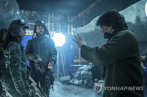 ▲ This undated AP photo shows director Bong Joon-ho (R) communicating with actors during the filming of "Mickey 17." (Yonhap) |