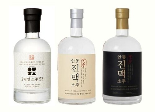 | ▲ From left: Yangpyeong Wheat Soju 53 (Ubou Juchaek), Andong Jinmaek Soju 40°, and Andong Jinmaek Soju 53° (Maenggae Suldoga), screenshot from the brewers' website. (PHOTO NOT FOR SALE) (Yonhap) |