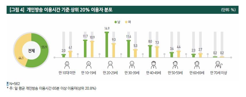 게임의 경우 전체 응답자(20분)보다 개인방송 이용 시간 상위 20% 이용자(50분)가 하루 평균 약 30분 더 이용하는 것으로 조사됐다.