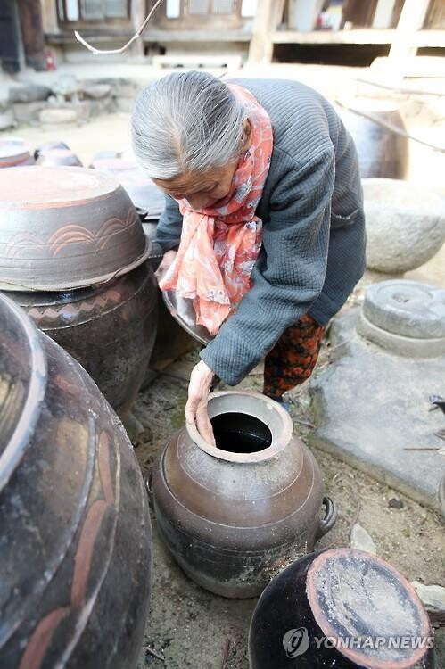 ▲ In Gure, Jeollanam-do, Lee Gil-sun (83, female), the 9th-generation head of the family, inspects a soy sauce jar estimated to be over 230 years old at the Omi-ri Unjoru traditional house on January 13, 2017. (Yonhap) |
