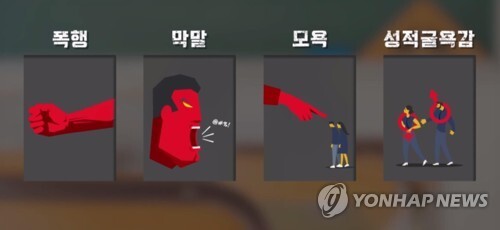 | ▲ This illustration shows four different types of hak-pok (from the left): physical abuse, verbal abuse, insults, and sexual violence. |