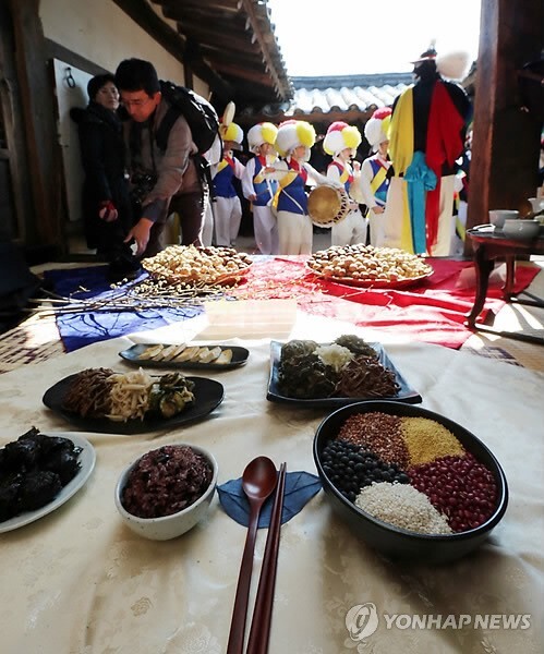 | ▲ On February 21, 2013, three days before the first full moon of the lunar year, visitors at the National Folk Museum of Korea in Seoul are examining the displayed five-grain rice during the Seolnal festival events. (Yonhap) |