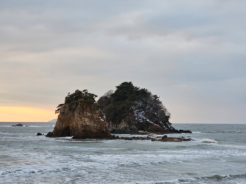 Above the sea waves in Taean, two rocks emerge, seemingly about to touch. They are two separate entities, but together create a poignant scene.