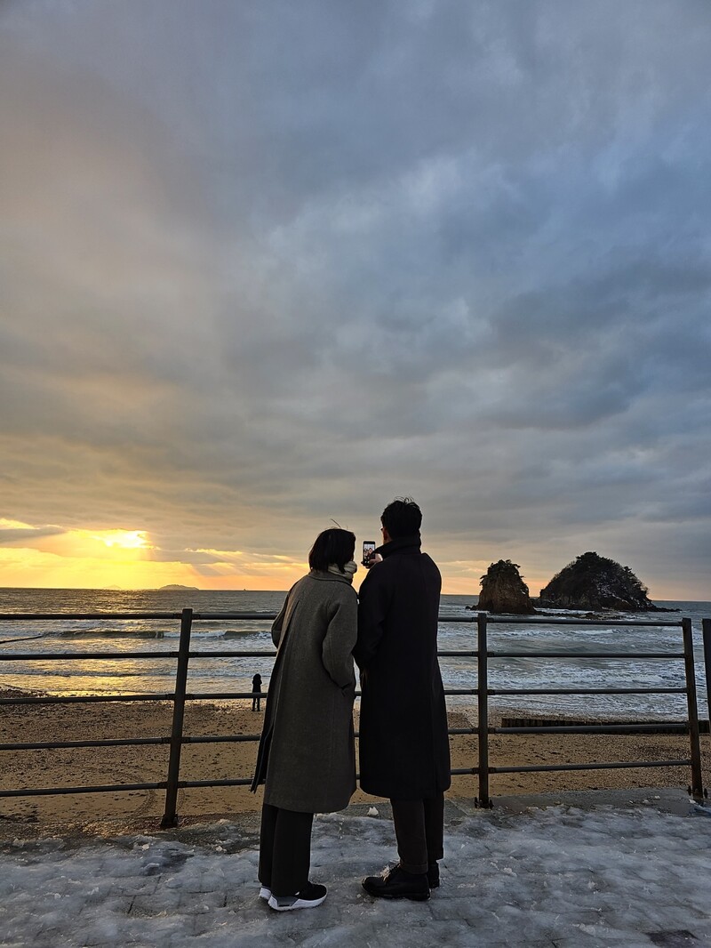 It feels different. It's nice to see that the winter sea is not too cold. My daughter-in-law, Heain, gazes at my son. The love between the two dear ones is apparent.