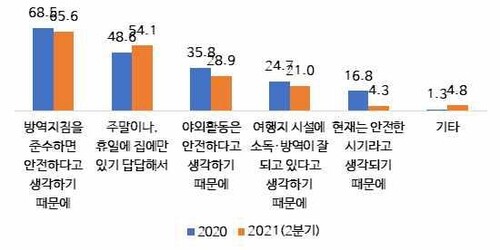 국내 여행을 계획하는 이유(복수 응답)는 '방역지침을 준수하면 안전하다고 생각하기 때문에'라는 응답이 지난해(68.5%)와 올해(65.6%) 모두 가장 많았다.