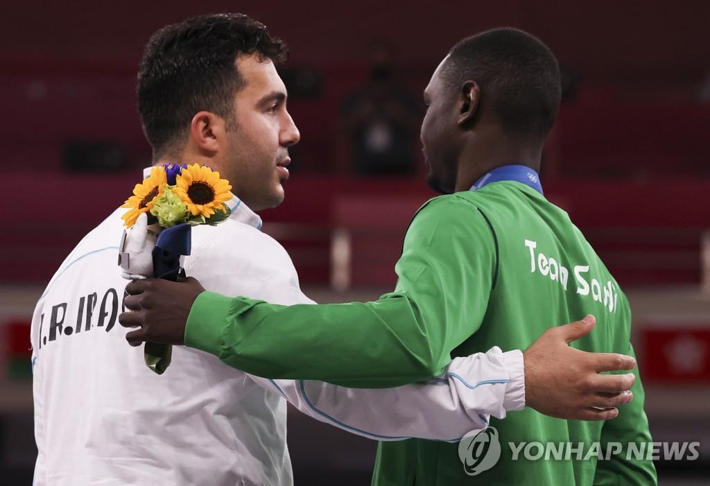 | ▲ 메달 시상식에서 서로 격려하는 하메디(오른쪽)와 간자데 [로이터=연합뉴스] |