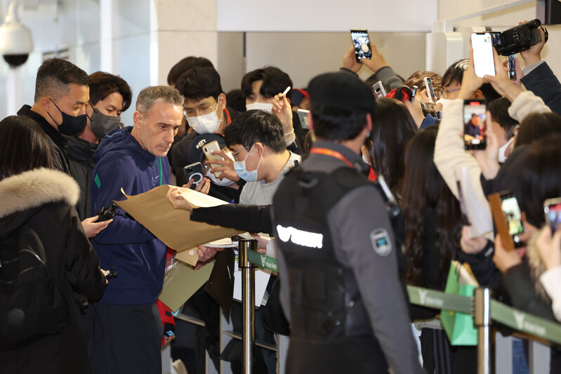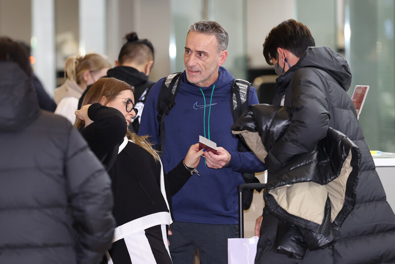 Paulo Bento, former head coach of the South Korean men's national football team, smiles while preparing to depart for his native Portugal at Incheon International Airport, west of Seoul, on Dec. 13, 2022, ending his four-year service in South Korea. Bento led his team to the round of 16 at this year's World Cup. (Yonhap)