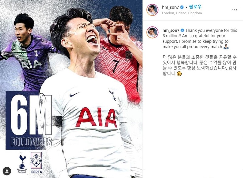 | ▲ This photo, a captured image from Son Heung-min's official Instagram account, shows Son Heung-min marking his 6 million followers on Instagram. (PHOTO NOT FOR SALE) (Yonhap) |