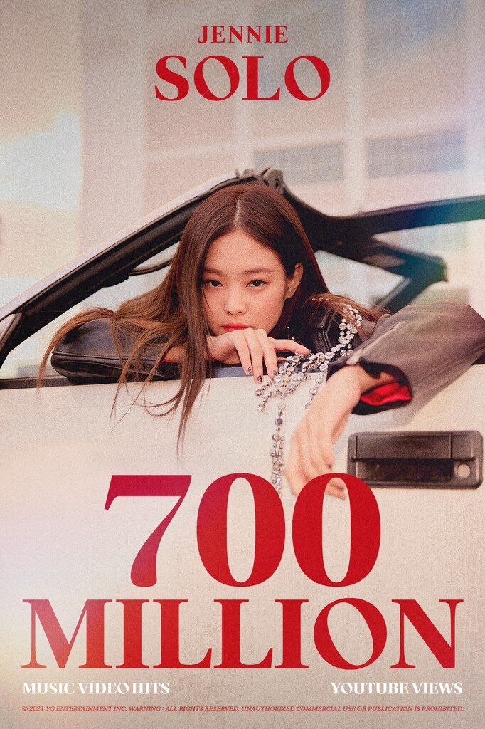 "SOLO," released by Jennie in 2018, surpassed 700 million YouTube views on Monday, breaking the highest number of views for a K-pop female solo artist's music video.