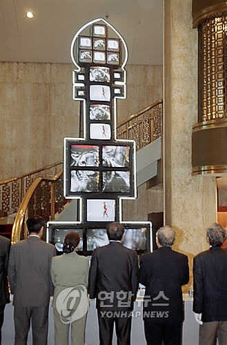| ▲ This image shows "Tiger is Alive" by Nam June Paik Installed at Seoul Sejong Center Grand Theater. Paik Nam-june's video sculpture titled "Tiger is Alive" has been installed at the Grand Theater of the Seoul Sejong Center for the Performing Arts. The artwork, created on July 5, 2001, centers on the traditional Korean folk mascot, the tiger, symbolizing earth peace, coexistence, and unification. The sculpture comprises two main elements, "Wolgeum" (moon lute) and "Cello," embodying the aspirations and future vision of these themes. (Yonhap) |