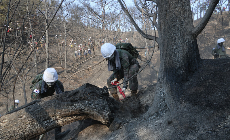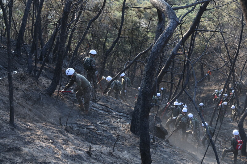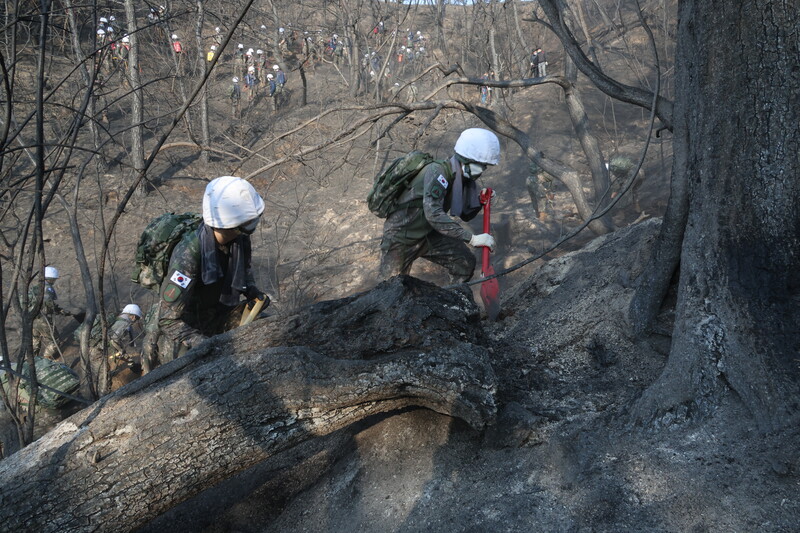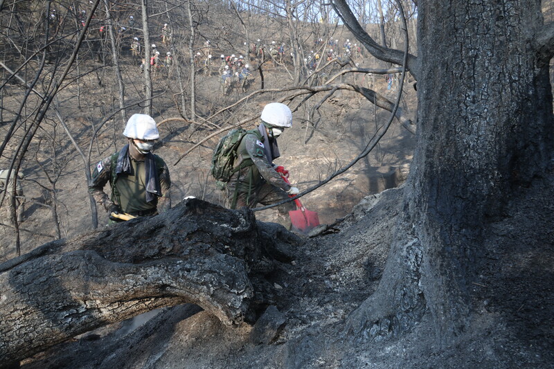 Soldiers are mobilized to put out a smoldering wildfire at Mount Inwang in central Seoul on April 3, 2023, after the fire broke out the previous day, burning some 14 hectares of woods. (Yonhap)