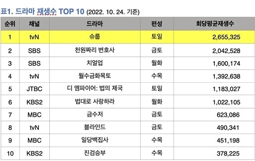 The average number of plays per episode was about 2.66 million, leading the top position among the currently airing dramas. It far exceeds that of SBS's “One Dollar Lawyer” (2.04 million episodes) starring Nam Goong-min, which aired three weeks earlier.