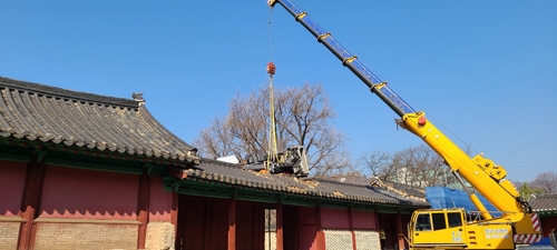 (서울=연합뉴스) 문다영 기자 = 서울 종로구 성균관 문묘 동삼문 지붕 일부가 훼손됐다.