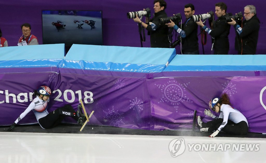 | ▲ [올림픽] 넘어지는 심석희와 최민정 (강릉=연합뉴스) 김동민 기자 = 2018년 2월 22일 강릉아이스아레나에서 평창동계올림픽 쇼트트랙 여자 1,000m 결승전 중 심석희(3번)와 최민정(6번)이 충돌해 넘어지고 있다. 2018.2.22 image@yna.co.kr |