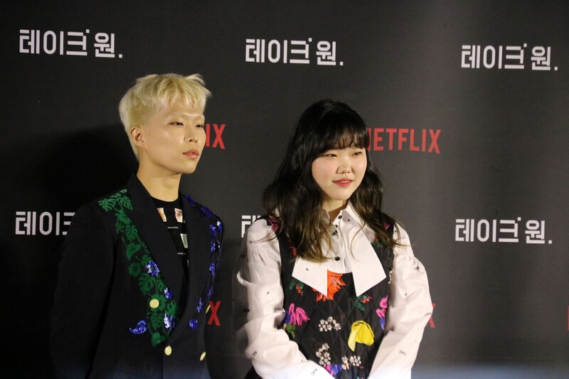 These photos show AKMU's Lee Chan-hyuk and Lee Su-hyun, and the producer of the show during the press conference for the new Netflix first Korean-language music variety show "Take 1."