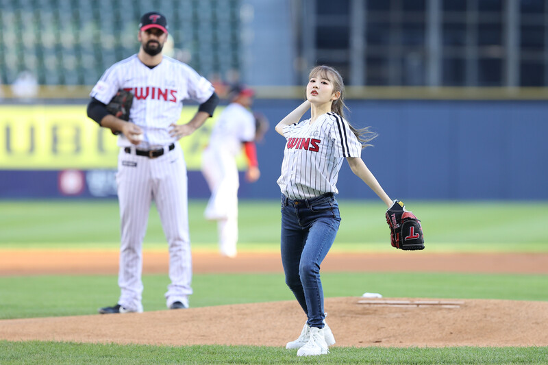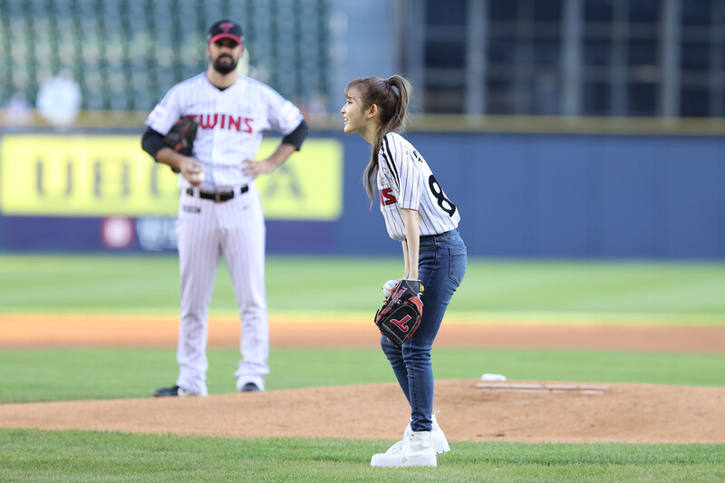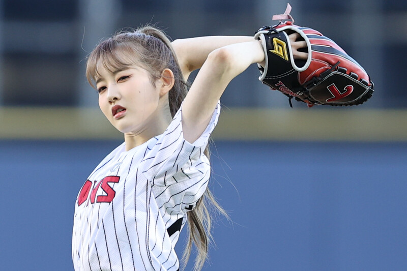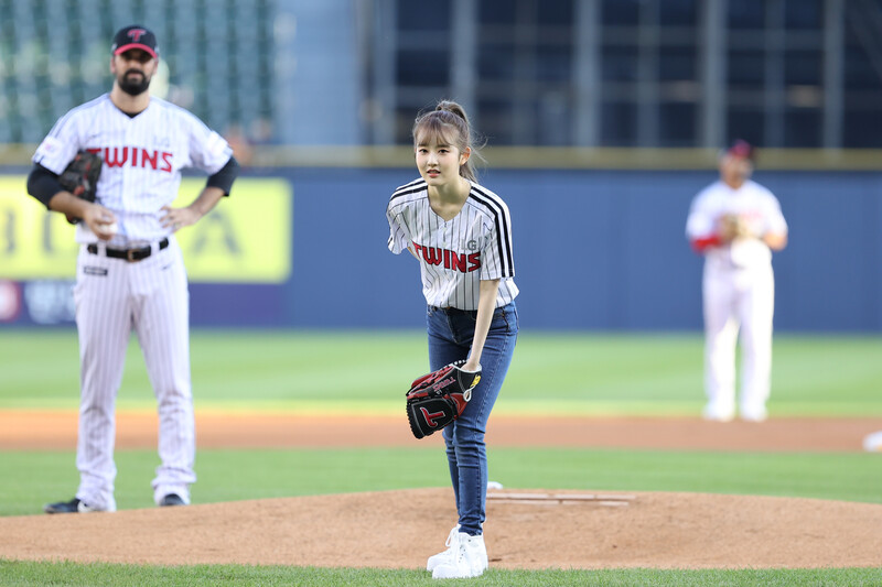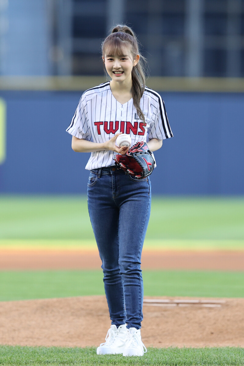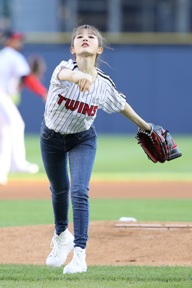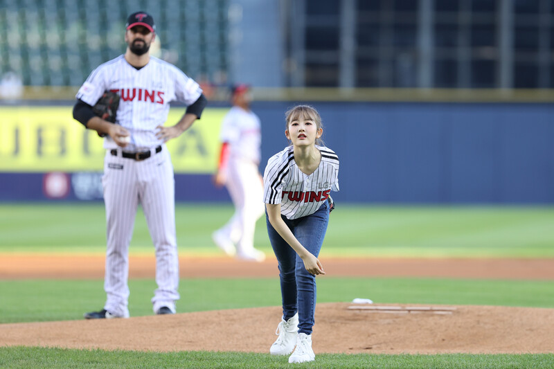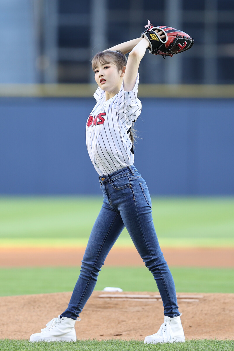 STAYC's Sieun throws the first pitch during Korea Baseball Organization regular season game, LG twins against Samsung Lions held at Jamsil baseball stadium on August 16.