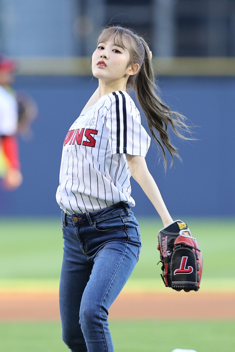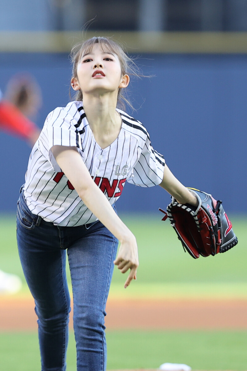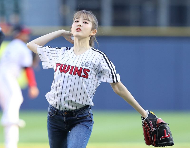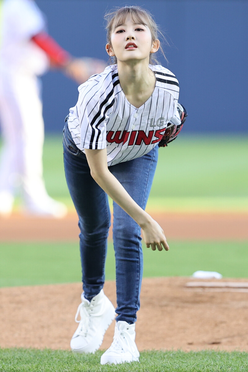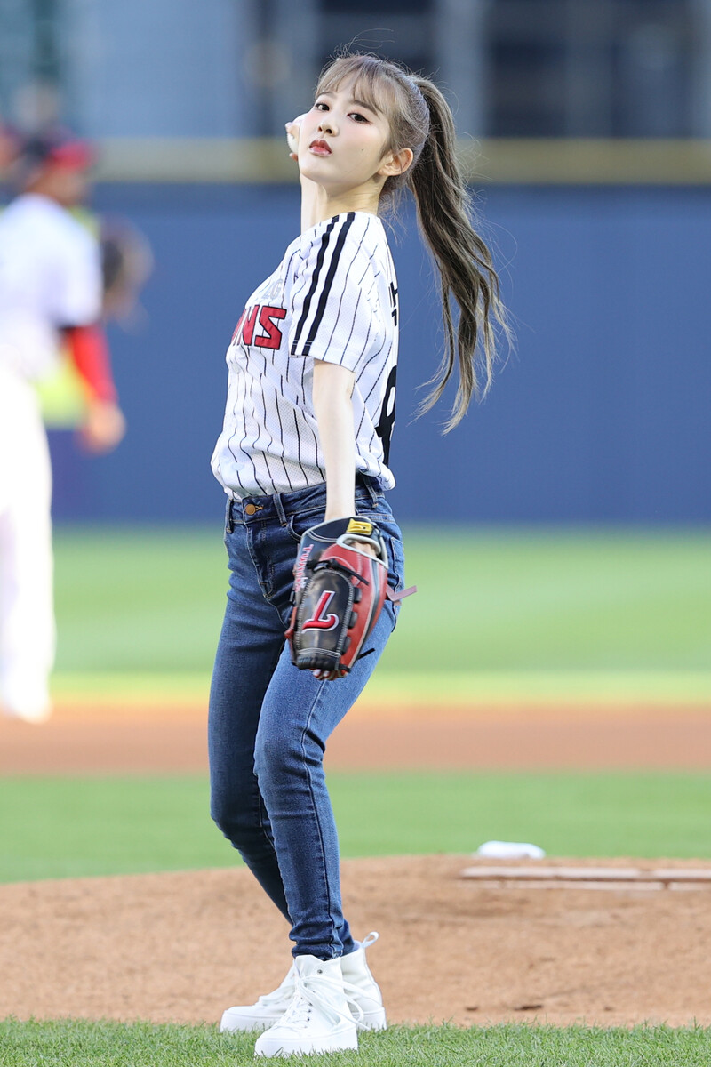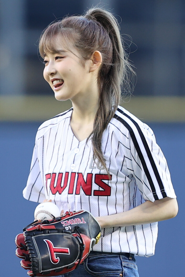 STAYC's Sieun throws the first pitch during Korea Baseball Organization regular season game, LG twins against Samsung Lions held at Jamsil baseball stadium on August 16.