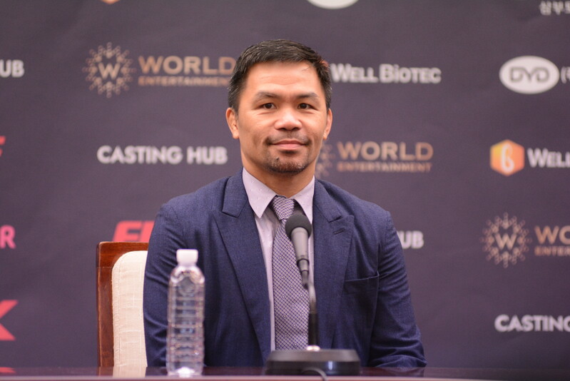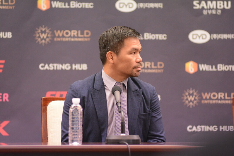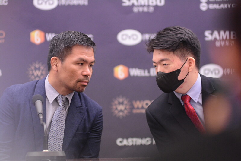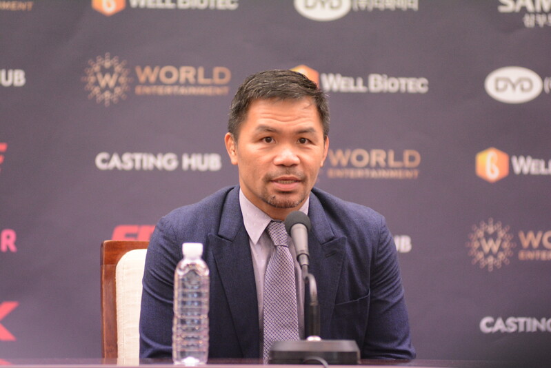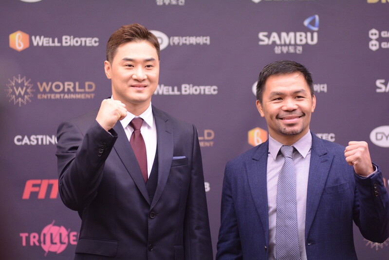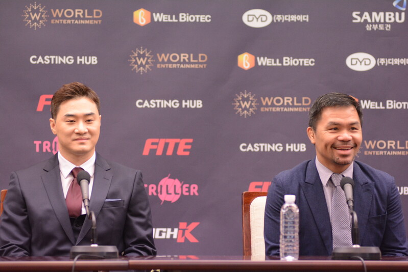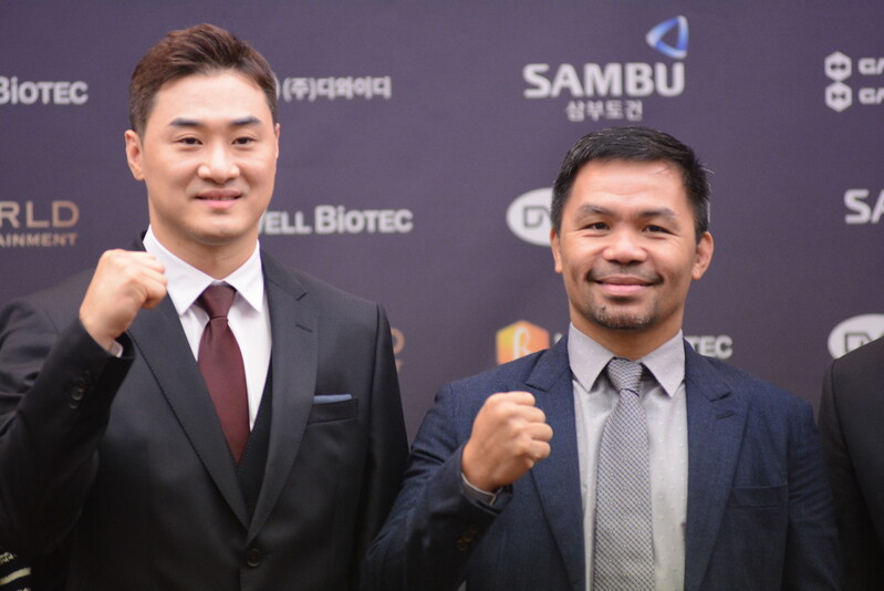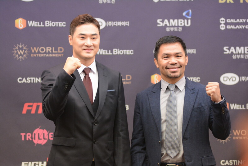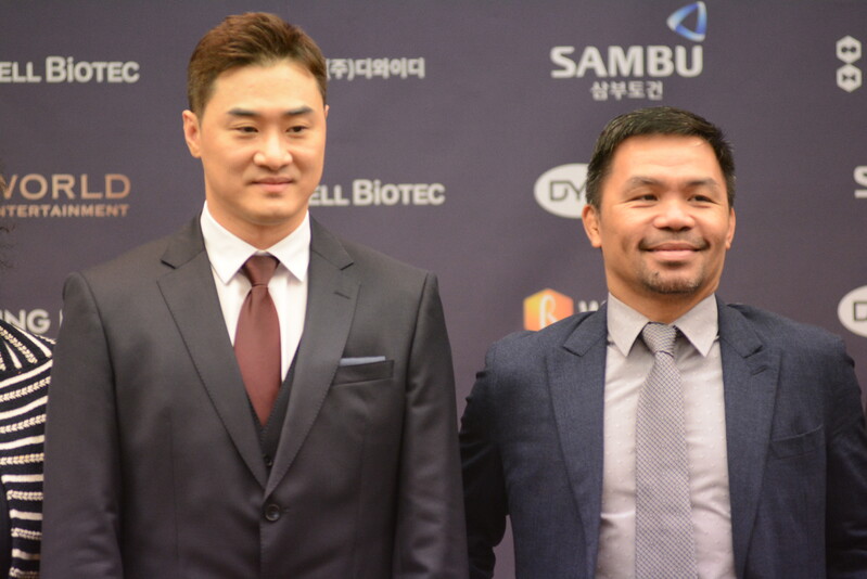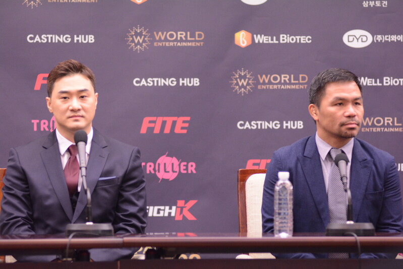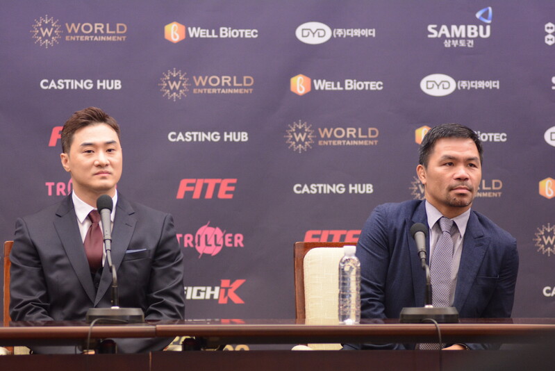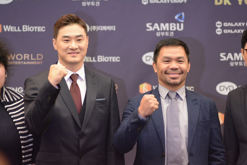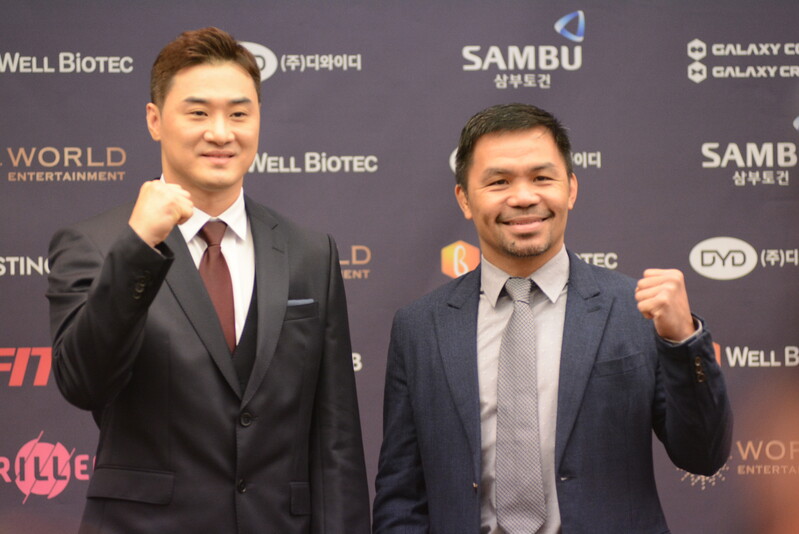These photos taken during the press conference for the upcoming exhibition match between Manny Pacquiao and DK.Yoo show both DK.Yoo and Manny Pacquiao posing for their photos and answering questions.