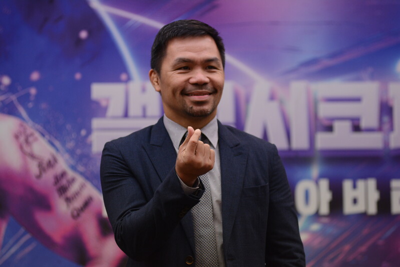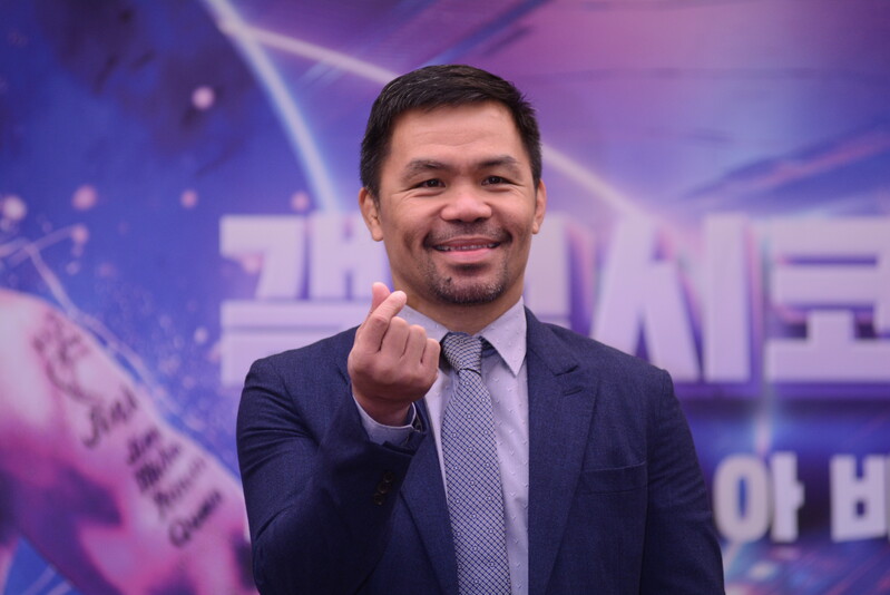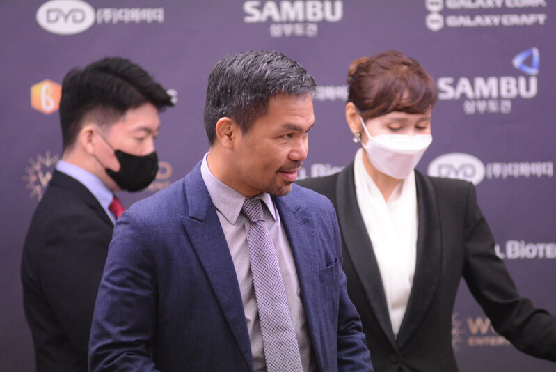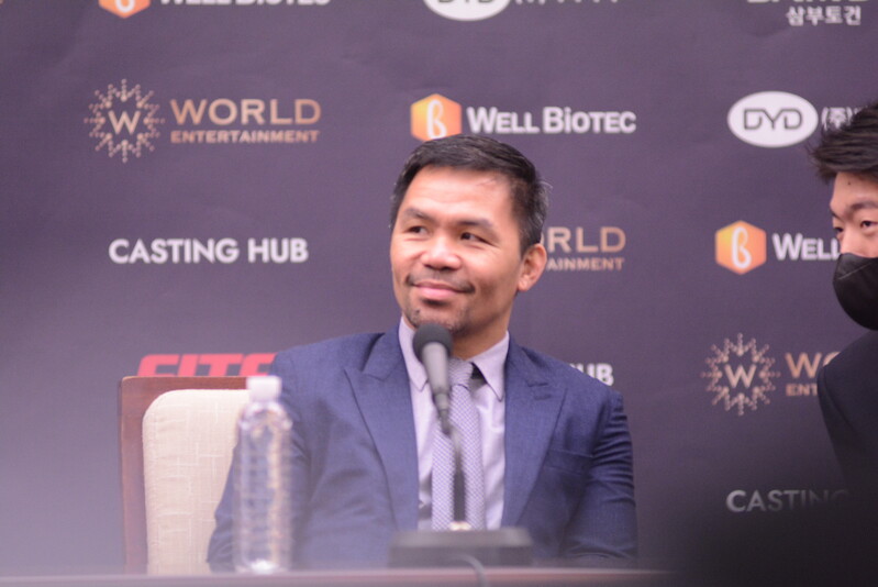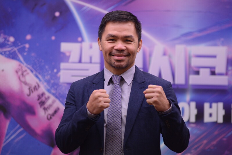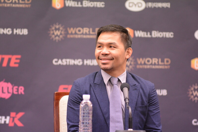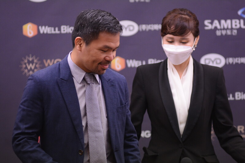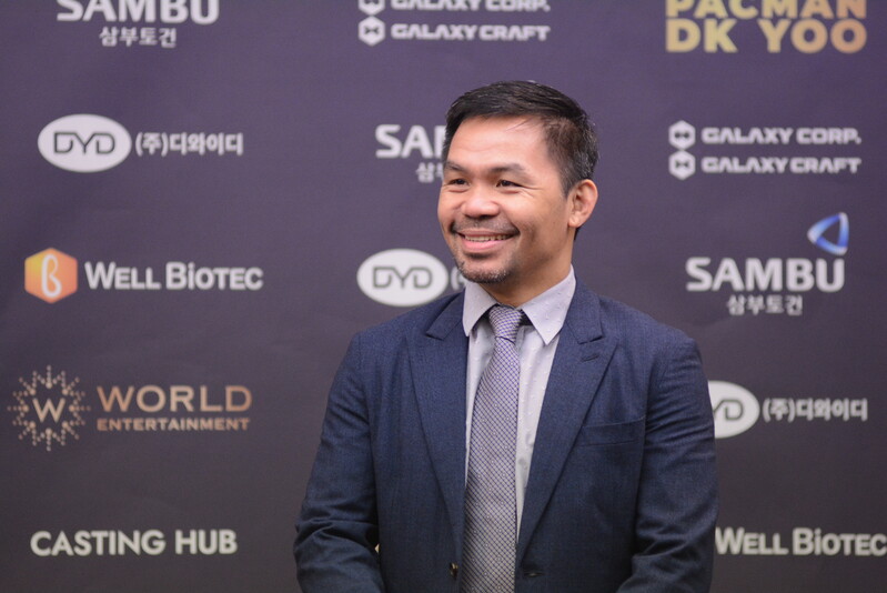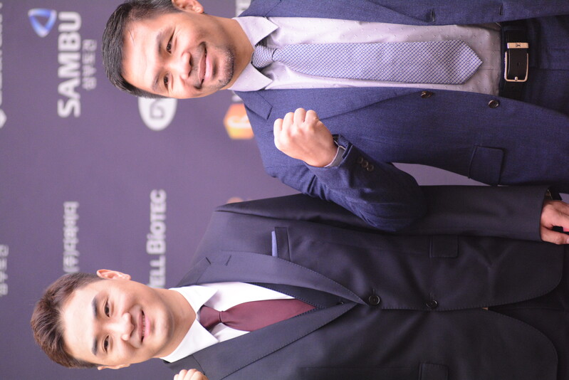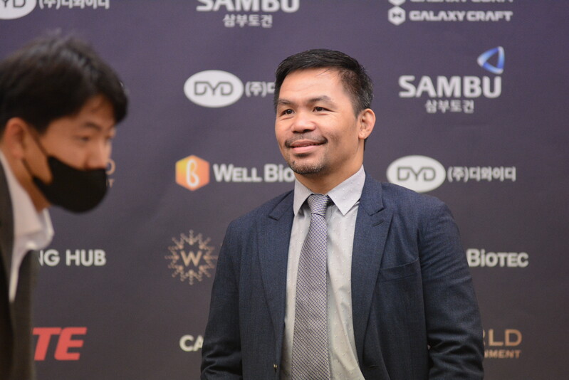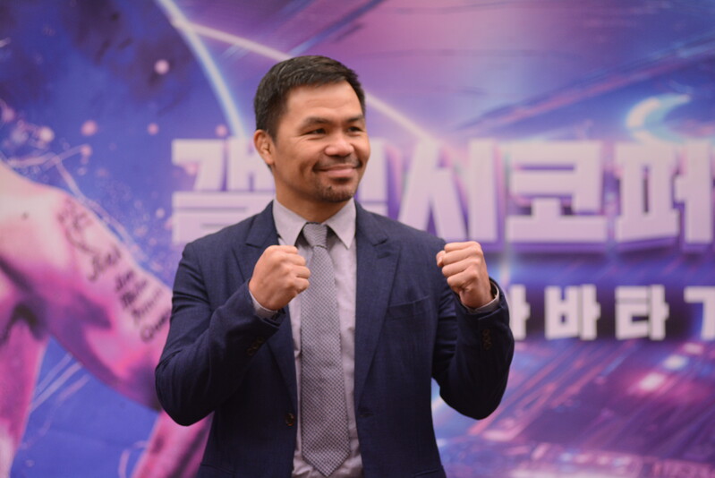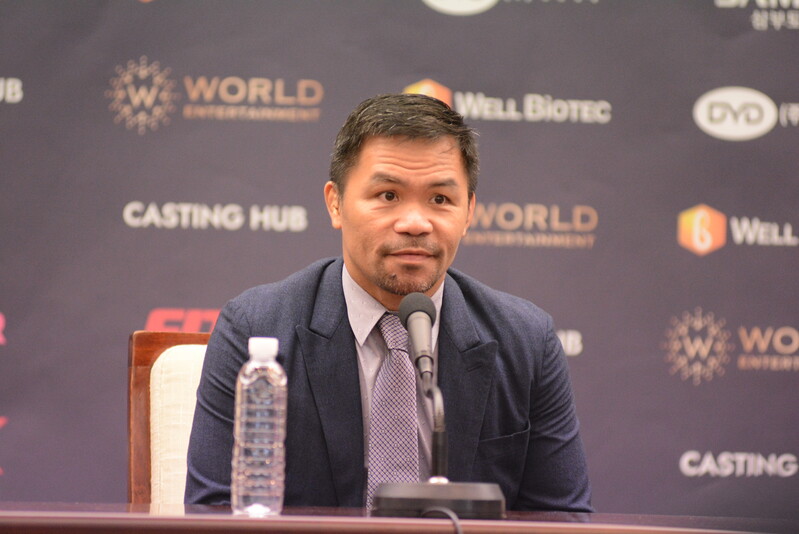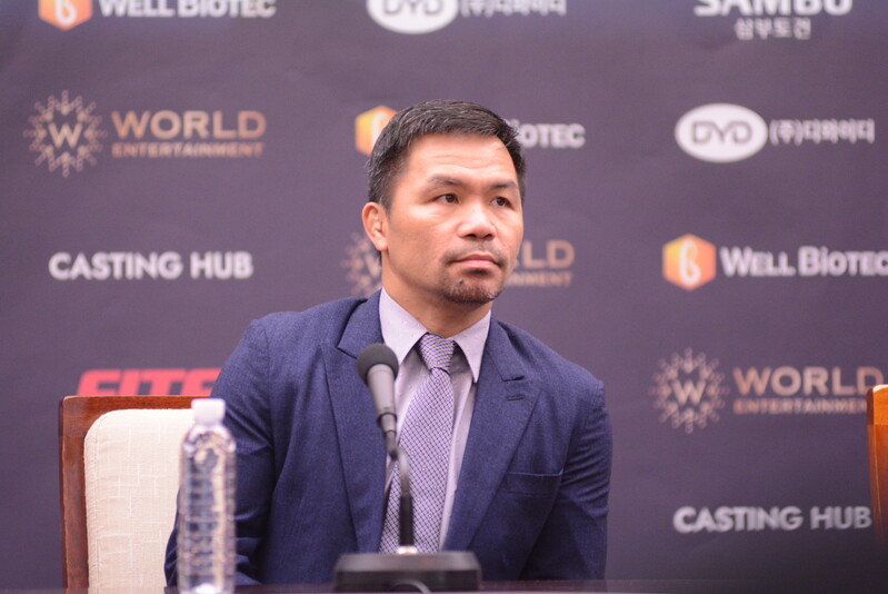These photos taken during the press conference for the upcoming exhibition match between Manny Pacquiao and DK.Yoo show both DK.Yoo and Manny Pacquiao posing for their photos and answering questions.