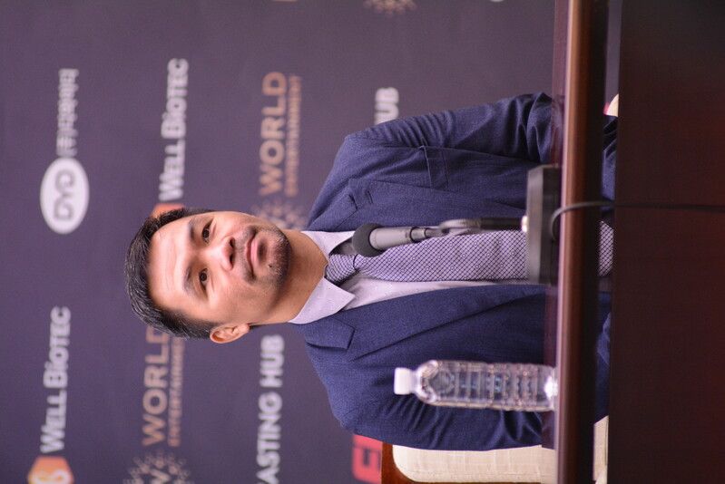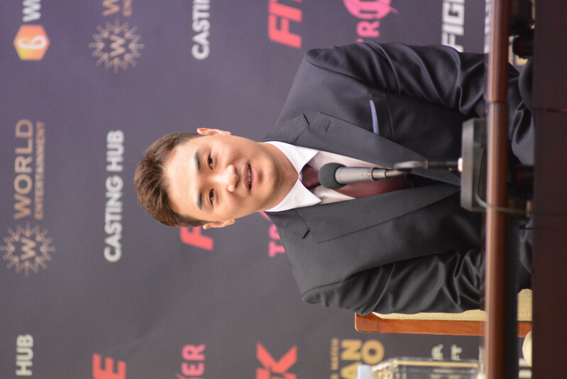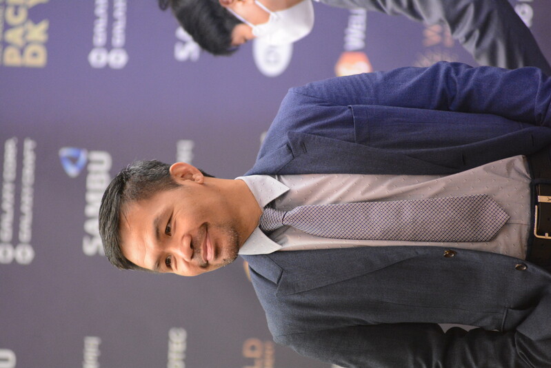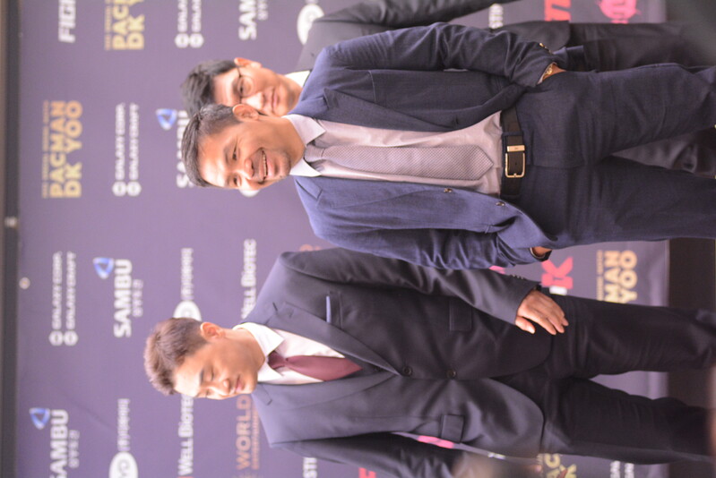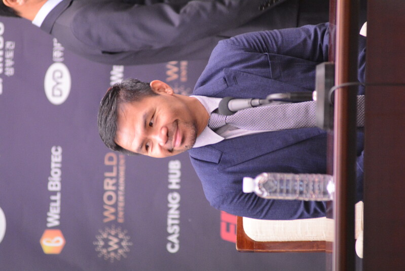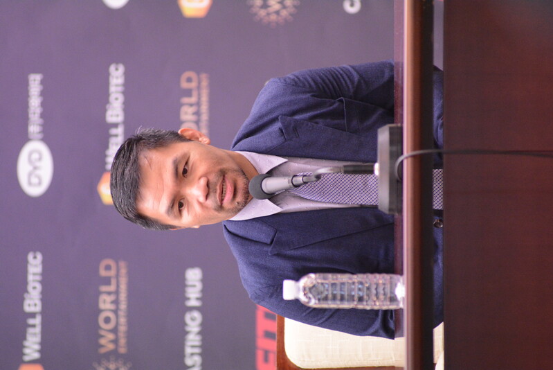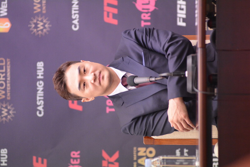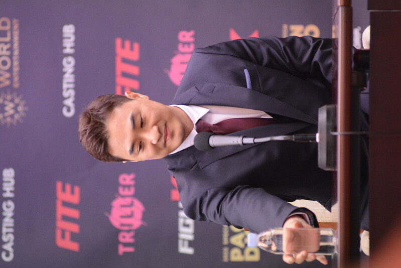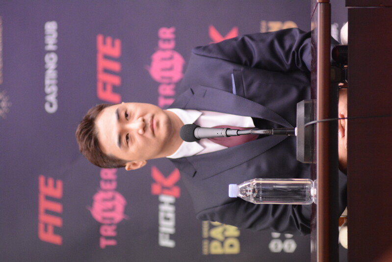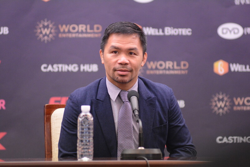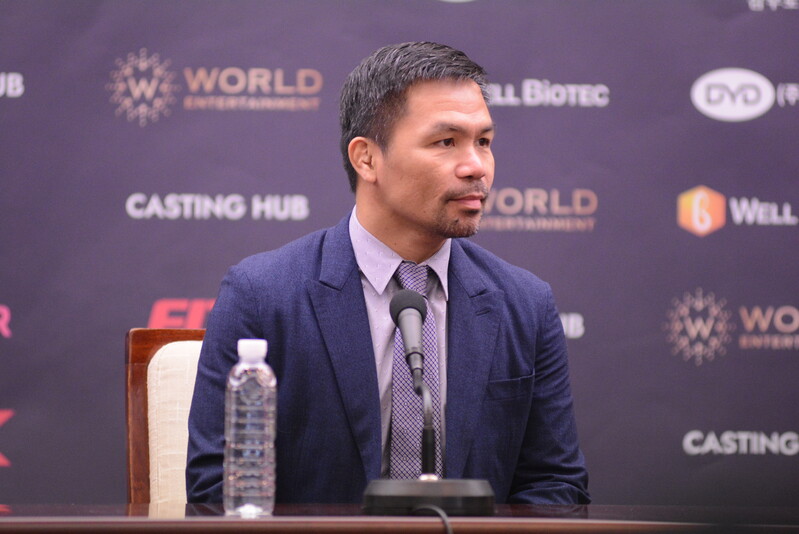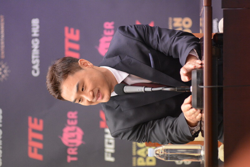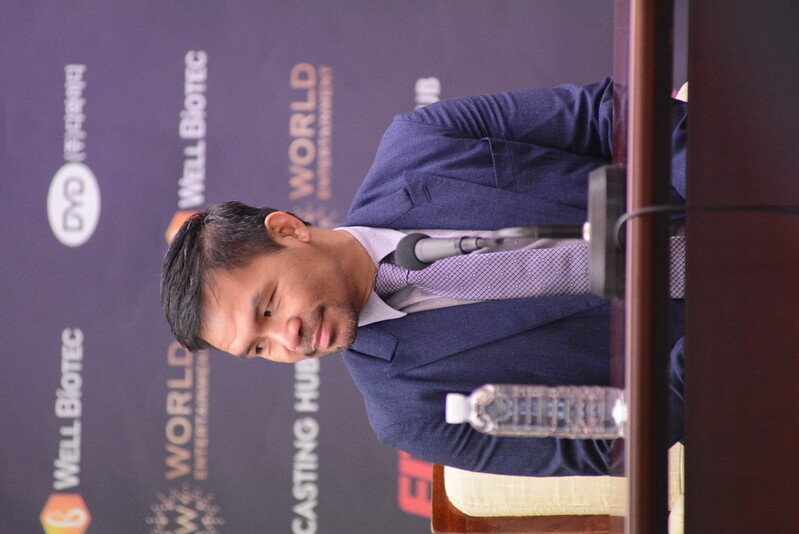 These photos taken during the press conference for the upcoming exhibition match between Manny Pacquiao and DK.Yoo show both DK.Yoo and Manny Pacquiao posing for their photos and answering questions.