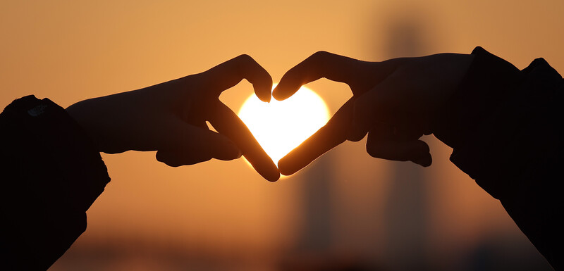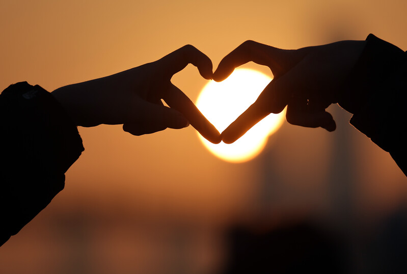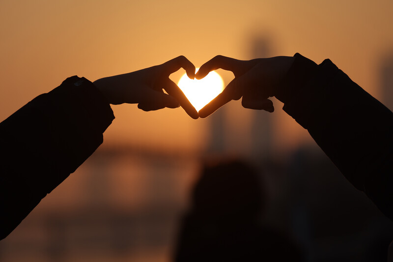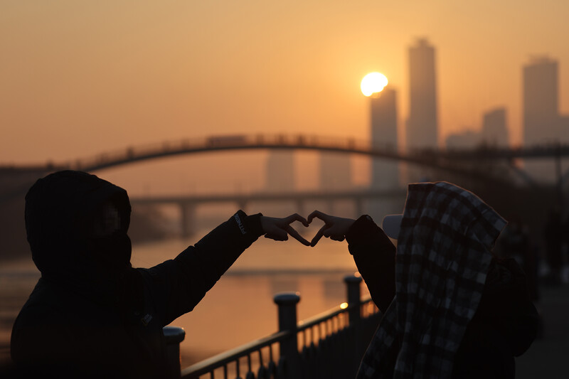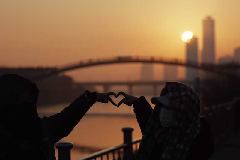 Citizens draw hearts with their hands as they watch the first sunrise of the new year at Seonyudo Park in Yeongdeungpo-gu, Seoul onJan. 1, 2023. (Yonhap)