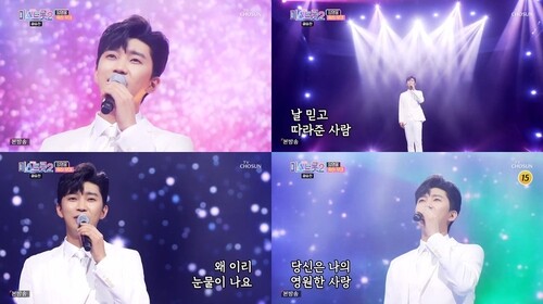 | ▲ These photos provided by New Era Project show clips of Lim Young-woong performing his upcoming song on stage during the last episode of "Miss Trot 2". (PHOTO NOT FOR SALE) (Yonhap) |