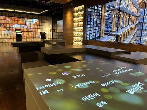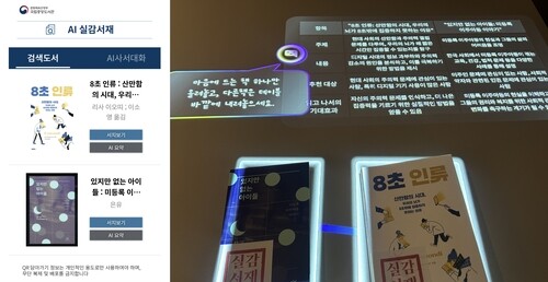 ▲ This photo, taken at the National Library of Korea in Seoul’s Seocho District on Oct. 14, 2025, shows the library’s AI-based immersive reading room, which offers “book curation services,” including one-line briefings, reading guides and multimedia content for 56 librarian-recommended titles. (Yonhap) |