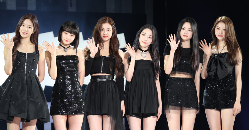 Members of South Korean girl group Le Sserafim pose during the publicity event in Seoul on May 2nd to mark the release of its debut album "Fearless." It is the first female group unveiled by the South Korean entertainment company, HYBE.