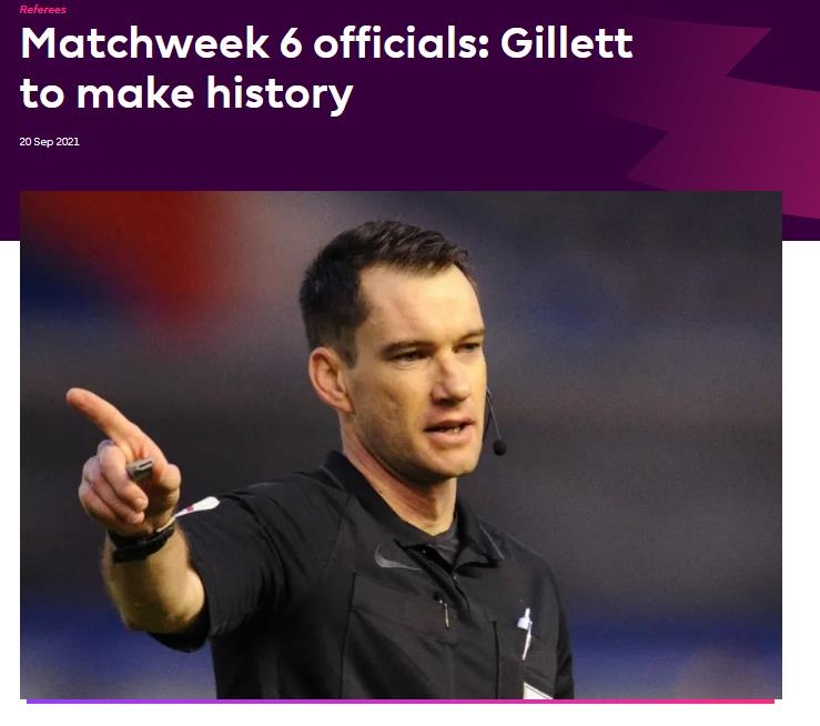 프리미어리그 사무국은 21일(한국시간) 홈페이지를 통해 EPL 6라운드 심판진을 발표하면서 "질레트 심판이 역사를 이뤘다. EPL 역대 첫 외국인 주심이 된다"고 전했다.