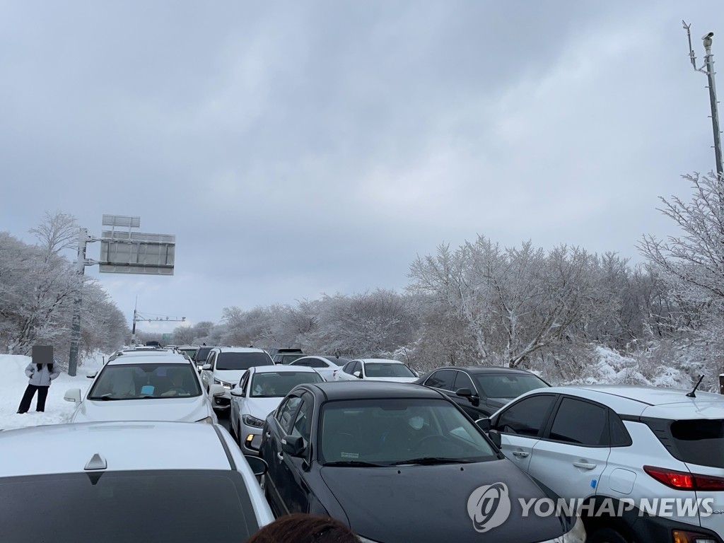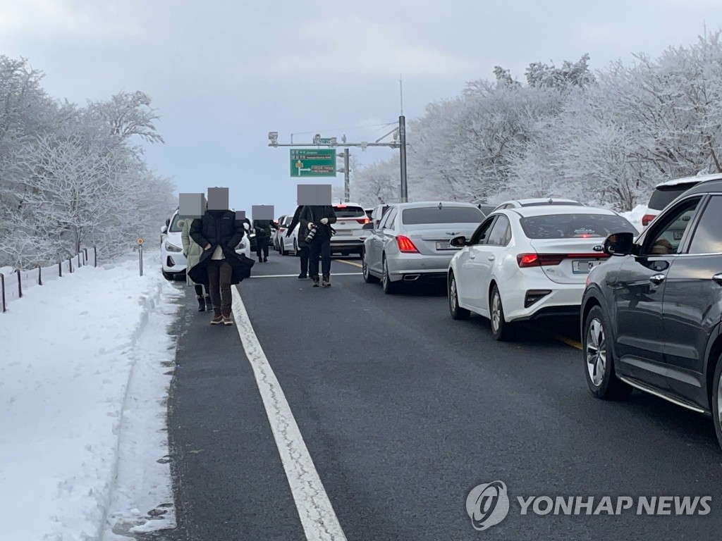| ▲ 사회적 거리두기 어려운 제주 1100고지 습지 (제주=연합뉴스) 고성식 기자 = 연말연시 강화한 사회적 거리두기가 시행되고 있는 2일 오전 제주 1100고지 습지 주변에 겨울 한라산 풍광을 감상하려는 관광객과 도민들이 몰려 교통난이 빚어지고 있다. 2021.1.2 koss@yna.co.kr |