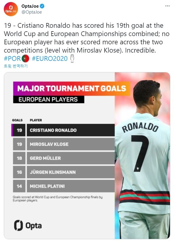 통계 전문 업체 옵타에 따르면 이날로 호날두는 유로와 국제축구연맹(FIFA) 월드컵 본선을 합해 가장 많은 득점을 올린 유럽 출신 선수 공동 1위에 올랐다.