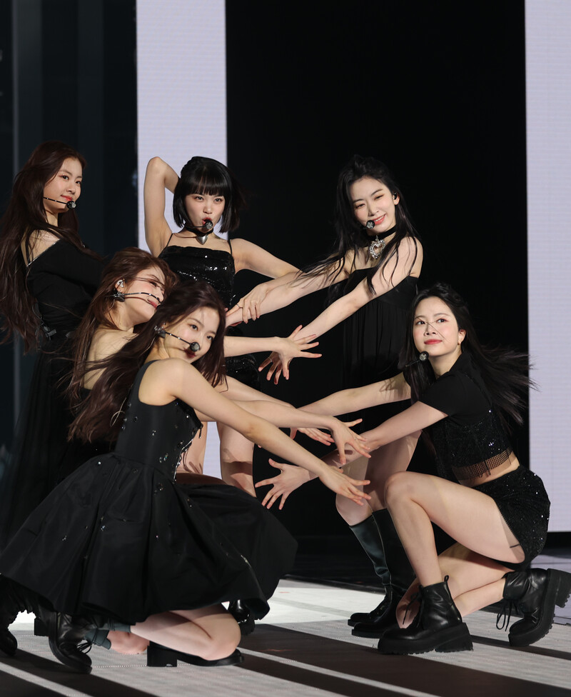 South Korean girl group Le Sserafim performs during a showcase for the group's debut album "Fearless" in Seoul on May 2, 2022. Le Sserafim is the first female group unveiled by South Korean entertainment company Hybe. (Yonhap)