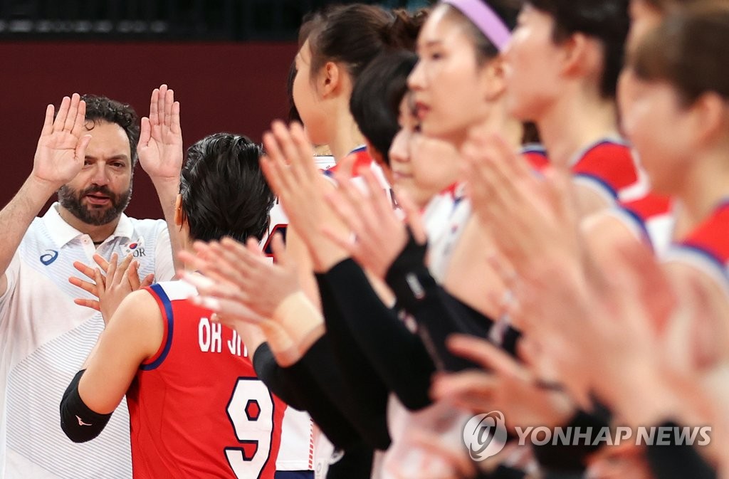 | ▲ [올림픽] '수고했어요, 여자배구' (도쿄=연합뉴스) 이지은 기자 = 8일 일본 도쿄 아리아케 아레나에서 열린 도쿄올림픽 여자배구 세르비아와의 동메달 결정전. 0-3으로 패한 한국 스테파노 라바리니 감독이 선수들과 하이파이브를 하고 있다. 2021.8.8 jieunlee@yna.co.kr |