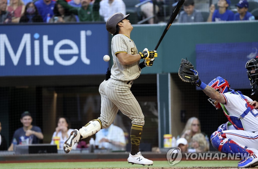 김하성은 11일(한국시간) 미국 텍사스주 알링턴 글로브라이프필드에서 텍사스 레인저스와 치른 미국프로야구(MLB) 정규리그 방문 경기에 9번 타자 유격수로 출전해 2-3으로 뒤진 5회초 선두 타자로 나와 동점 좌월 솔로 아치를 그쳤다.