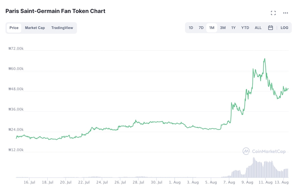 한편, 코인마켓캡에 따르면 6월 1만~2만원 사이에서 등락하던 PSG 팬 토큰은 메시의 입단 가능성이 커지자 덩달아 가격이 올라 7월 말에는 3만원을 돌파했다.
