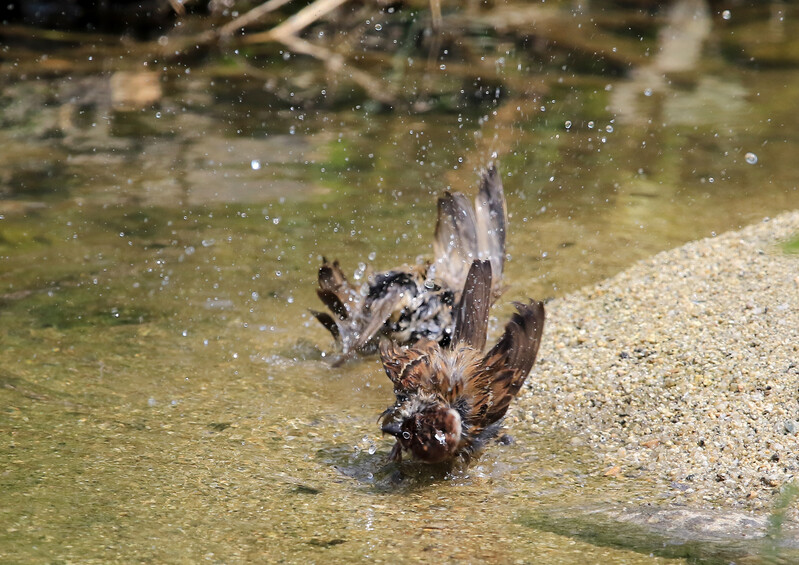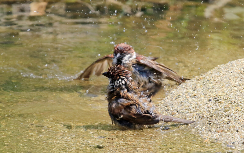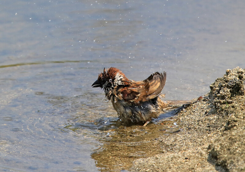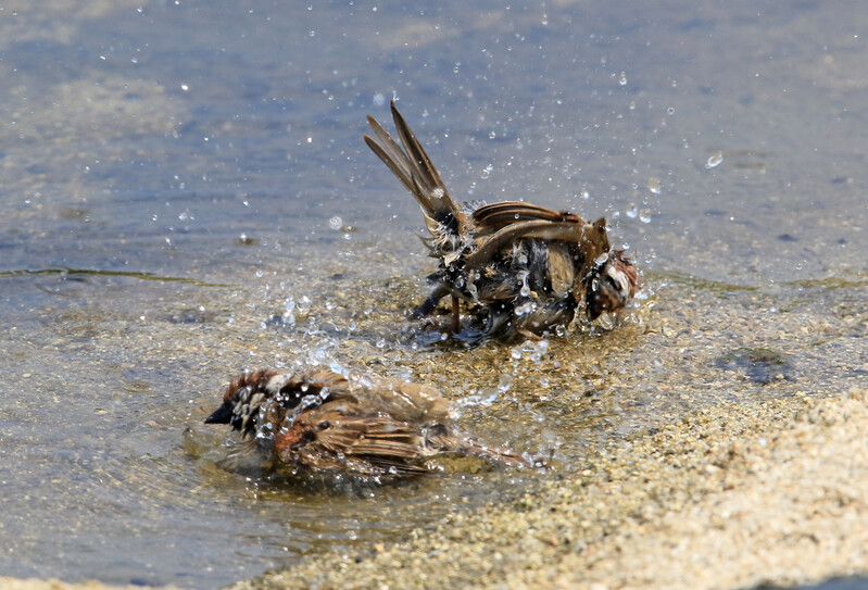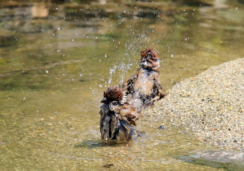 On the 19th, when the sweltering heat of over 30 degrees Celsius continued, sparrows gathered to cool off the heat by bathing in Namdaecheon, Gangneung-si, Gangwon-do. (Yonhap)