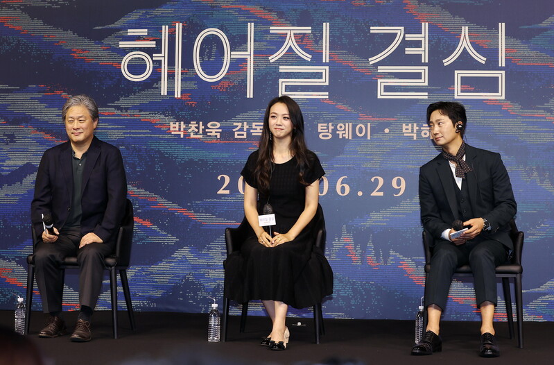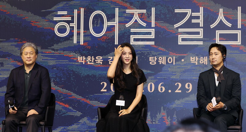 South Korean film director Park Chan-wook, who won Best Director for the film at the 75th Cannes Film Festival with "Decision to Leave," speaks during a showcase for the flick in Seoul along with its actors Tang Wei and Park Hae-il (from left) on June 2, 2022. (Yonhap)