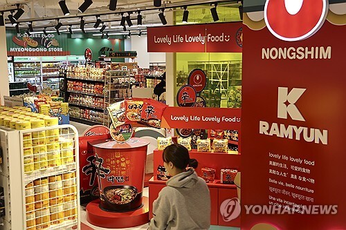 | ▲ Products of South Korean instant noodle giant Nongshim Co. are displayed at the company's brand zone in Myeongdong, one of Seoul's hottest tourist destinations, on Jan. 30, 2024. (Yonhap) |