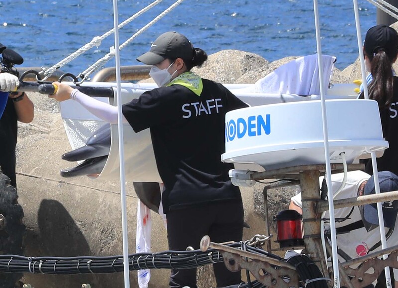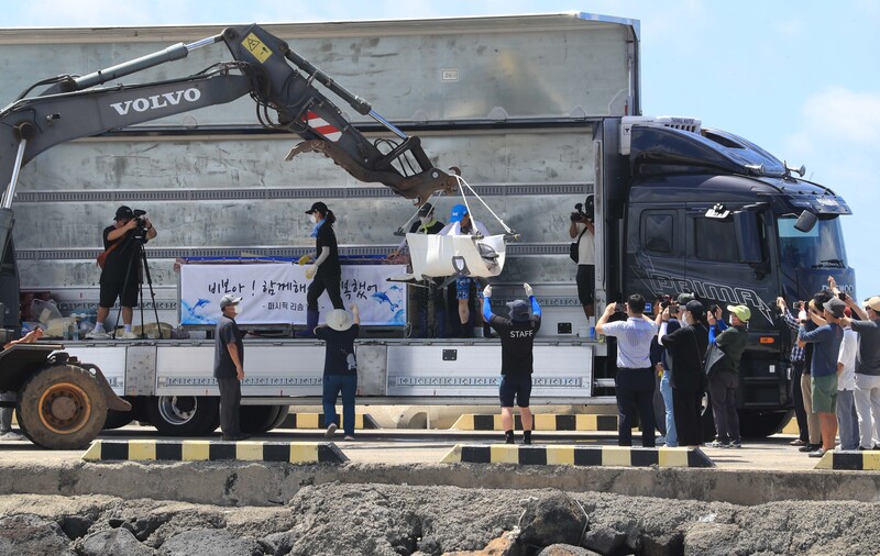 Bibong, a male Indo-Pacific bottlenose dolphin and believed to be 23 years old, is transported into a pen in the sea off Seogwipo on South Korea's largest island of Jeju on Aug. 4, 2022, as a step toward releasing him into the wild.