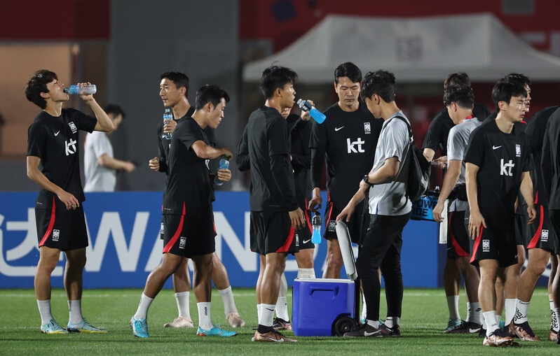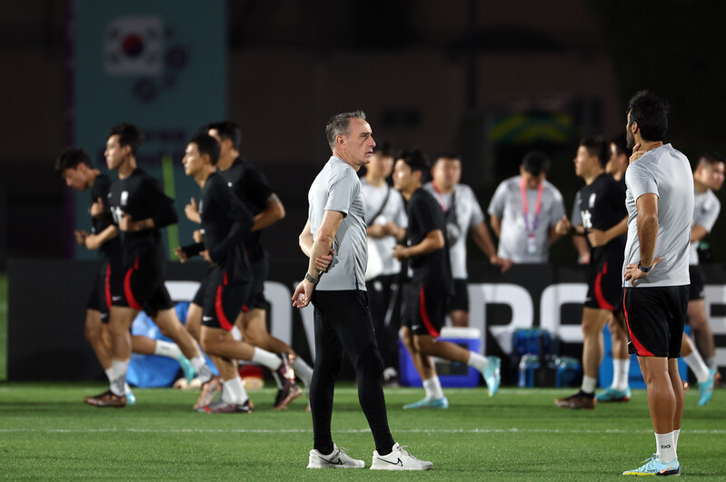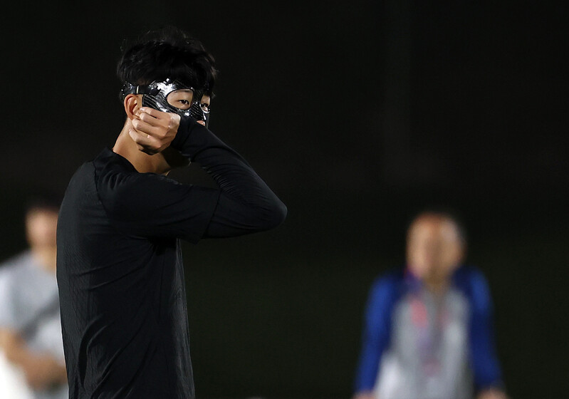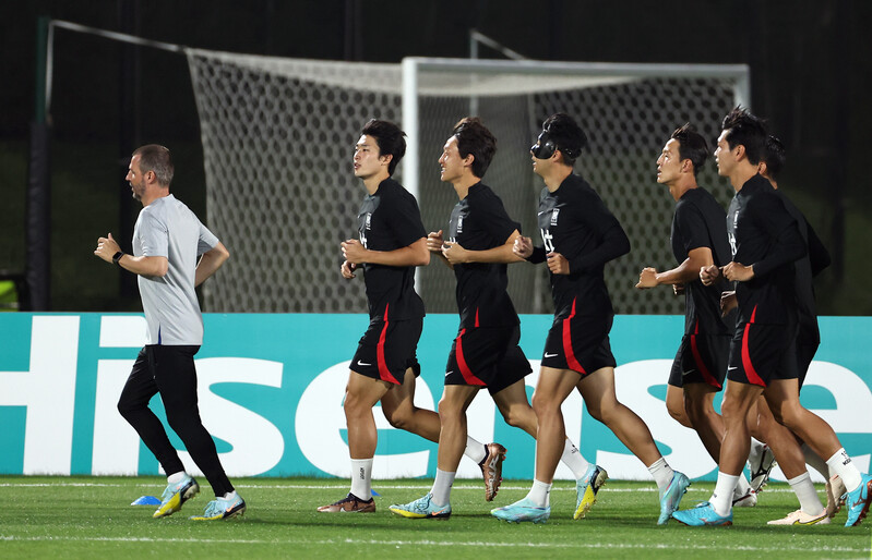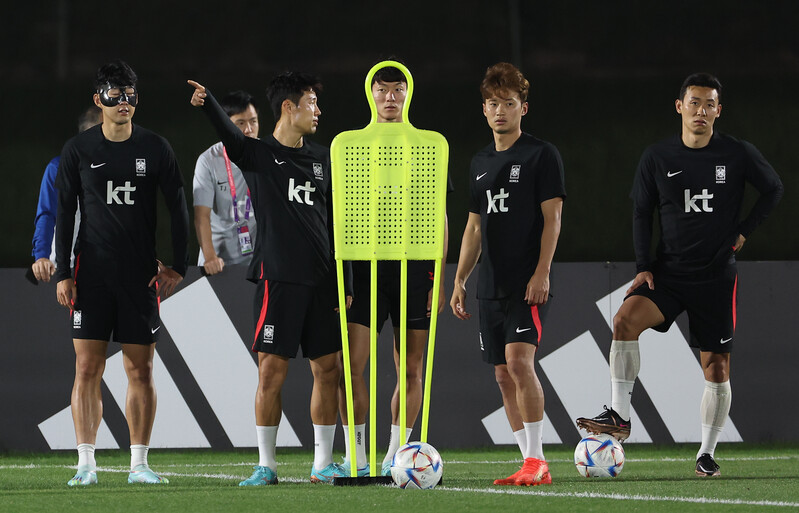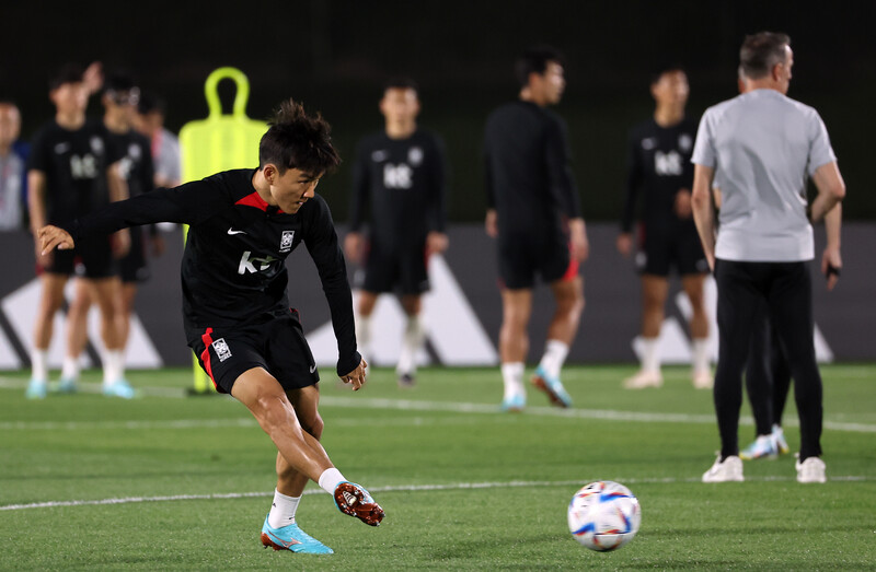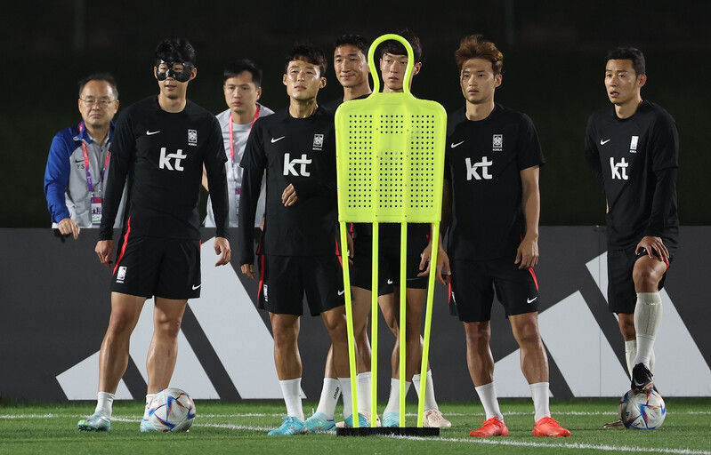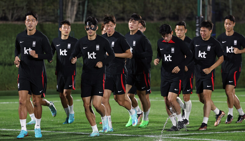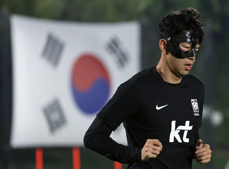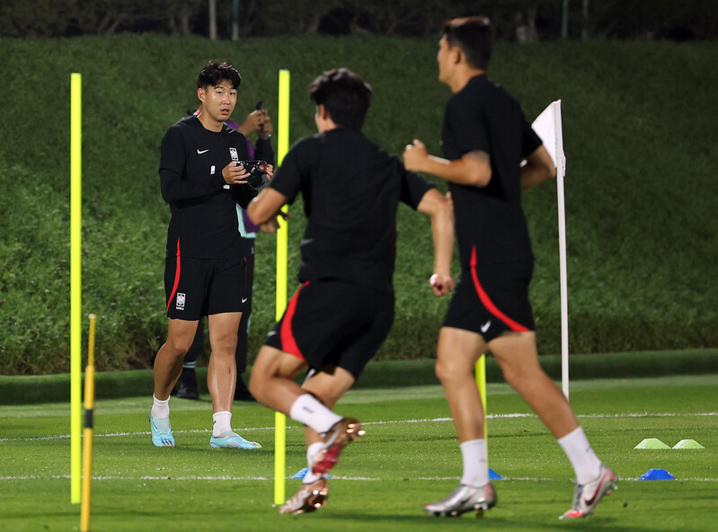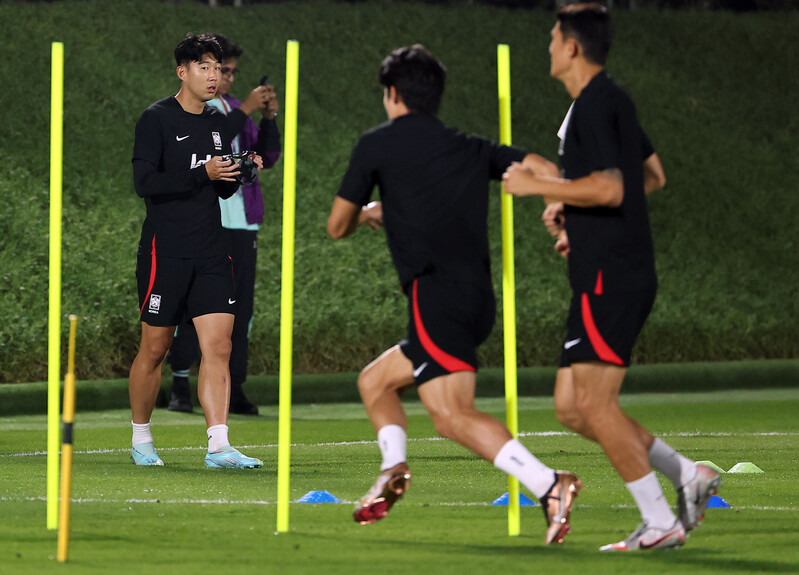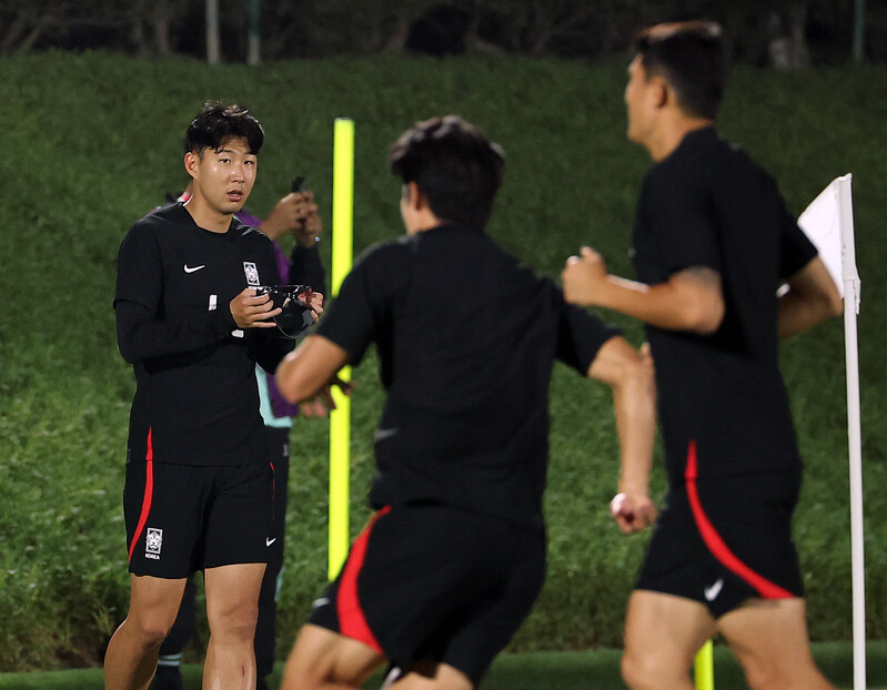 Including caption Son Heung-min, South Korean players train for the FIFA World Cup at Al Egla Training Facility in Doha, Qatar, on Nov. 19, 2022. (Yonhap)