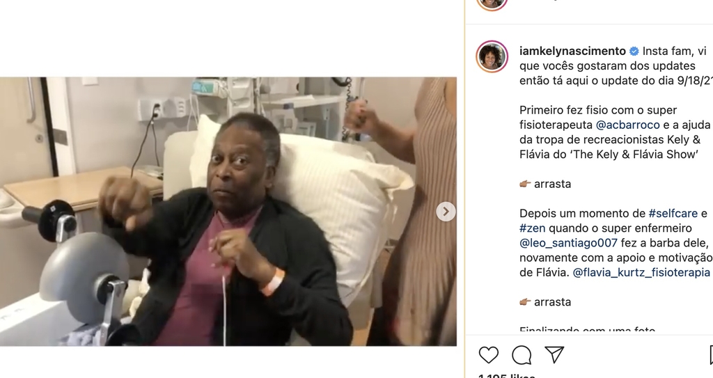 펠레의 딸 켈리 나시멘투는 19일(한국시간) 인스타그램에 아버지가 재활 운동을 하는 영상을 게시했다.